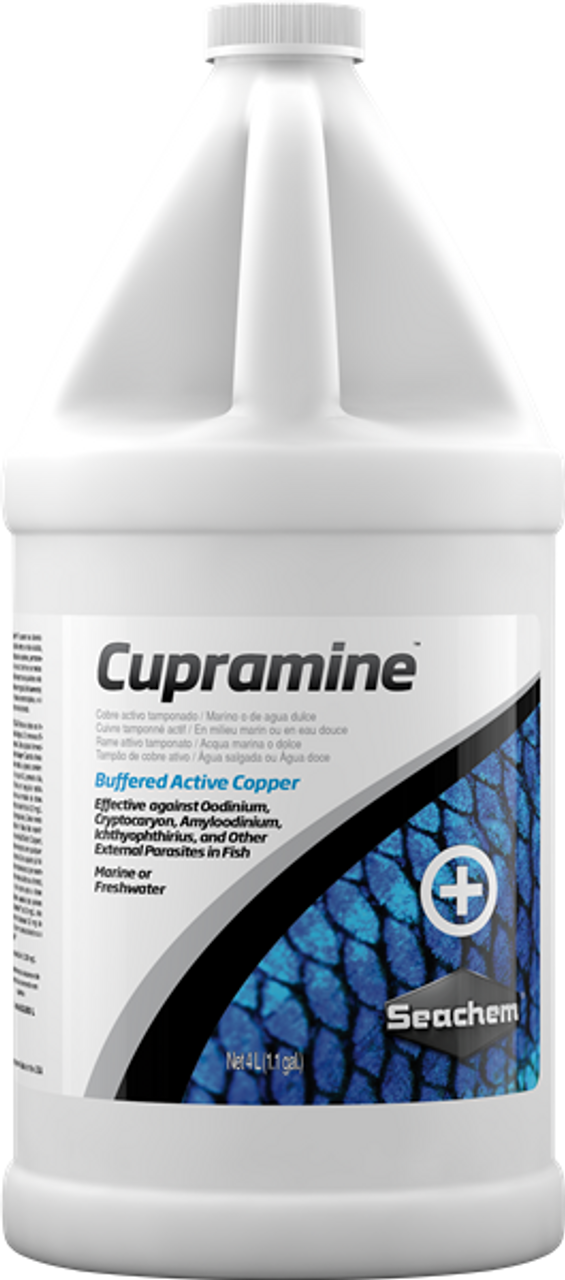 Cupramine effectively eradicates Oodinium, Cryptocaryon, Amyloodinium, Ichthyophthirius, and other ectoparasites of both freshwater and marine fish. It is superior to copper sulfate, chloride & citrate: it is non-acidic, less toxic to fish, remains in solution, and does not contaminate the filter bed. It is superior to chelates: it is fully charged (ionic), active at low concentrations, and is removable with carbon.